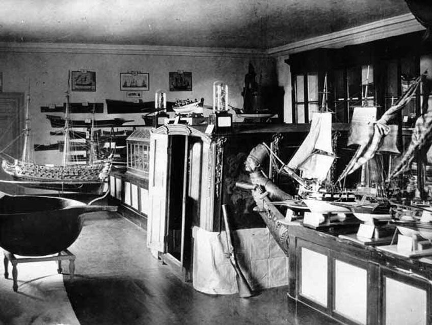 Военно-морской отдел той выставки составлялся под руководством конт-адмирала Н.И.Скрыдлова. Экспонаты исторической части Вы видите на фото , большая часть была доставлена из Петербурга. Но некоторые хранились и в поволжье и погибли в огне - это петровская пинасса , екатерининская лодка и галера "Тверь" сгоревшая в 1956 году в Казани , ну и вещи бывшие на их борту и есть у ряда историков подозрение , что пожар тот устроило руководство завода , которому не хотелось терять территорию и деньги на музейное хранение. Как бы то ни было , но исследований той выставки нет и мы не знаем , что и от куда было собрано. А многое утрачено с ходом лет! К примеру , картуш из клинков вокруг портрета Петра - он был составлен из спортивных клинков Морского Кадетского Корпуса и эти клинки потом хранились в военно-морском музее , но в начале 70-х годов были признаны "не историчными" и их "списали". Все те клинки просто порезали автогеном и высыпали обломки в Неву с Дворцового моста. Ряд вещей с той выставк