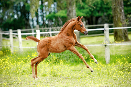 Жеребят можно обучать трюкам, но стоит помнить, что их опорно-двигательный аппарат только формируется, и излишняя нагрузка может серьезно повредить здоровью. Поэтому, выбирая элемент, следует отдавать предпочтение интеллектуальным задачам: апортировке, подзыву по имени, «улыбке», командам «да» и «нет». Из более сложных трюков жеребята могут исполнять трапецию, жамбет, несколько шагов осаживания и уступок.