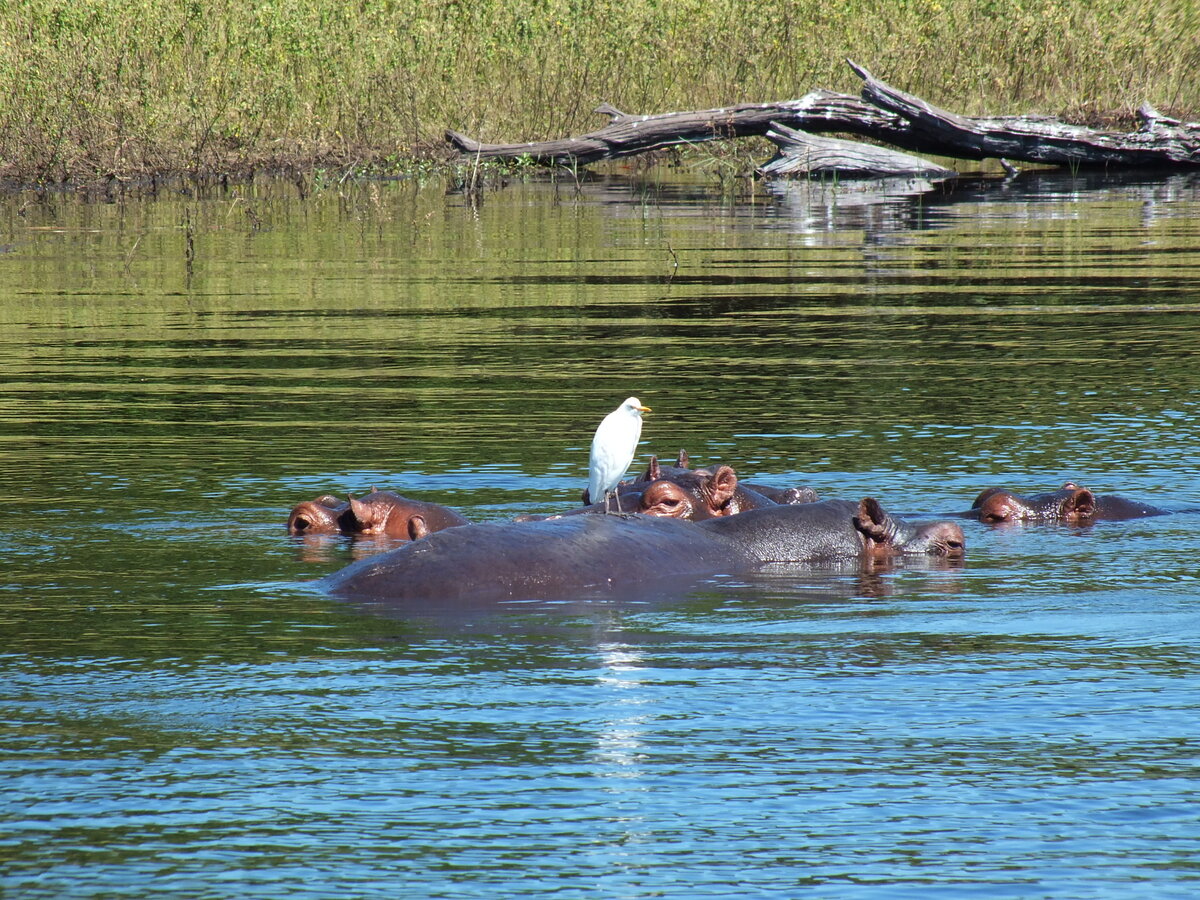 Парк Чобе в Ботсване (Африка) огромен. Мы были на северо-востоке парка в долине реки Чобе. Сначала экскурсия по реке Чобе вот на таком плавсредстве. Река Чобе хороша сама по себе. Какое дерево вдали! Как крокодил Гена из мультфильма :) Мы стараемся разглядеть на берегу диких животных. Сначала заметили белую цаплю. Оказывается, она сидит на бегемоте! На берегу видна машина. После экскурсии по реке мы тоже поедем на машине по берегу. В тени прячутся импалы (импала или чернопятая антилопа (лат. Aepyceros melampus) . Импал очень-очень много. Сначала фотографировали всех :) Крокодил! Вот соседи заметили кого-то на берегу. И все туда! Это идут буйволы! Вот они улеглись в воду. Видели много птиц. Чибис или пигалица-кузнец (Vanellus armatus). Африканская змеешейка (African Darter). Африканский орел-рыболов (орлан-крикун). После экскурсии по реке Чобе мы поехали по парку на машине. Но об этом в следующий раз.