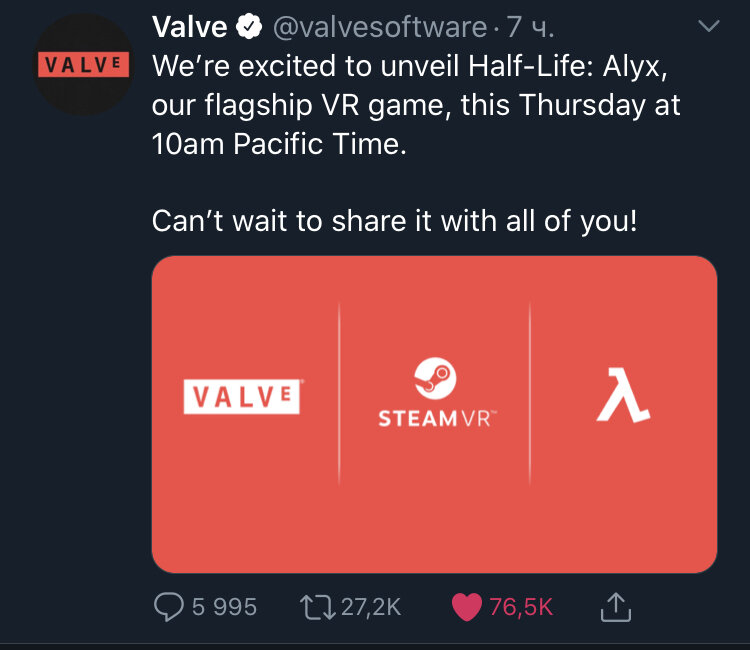 Valve опубликовала в твиттере интересный пост, который сейчас разносится по всему интернету «Мы рады открыть вам Half-Life: Alyx, нашу главную VR игру. В этот четверг в 10:00 по тихоокеанскому времени» После стольких лет ожиданий это свершилось. Да, там нет цифры 3. Но для всех фанатов это автоматически третья часть. Мы так долго этого ждали.