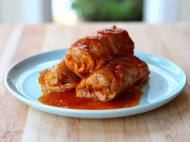 Продукты для приготовления голубцов: Мясной фарш ориентировочно пол кило, чуть больше среднего кочан капусты, одна большая луковица, средняя морковь, куриное яйцо, рис – 200-300г, соль, черный перец и красный молотый сладкий перец, помидор, болгарский перец, морковь, репчатый лук - по 1 шт., сметана - 2 ст. ложка. Для начала кочан тщательно вымойте и удалите верхние листки, затем острым ножом удалите кочерыжку, опустите вилок в кипящую воду на 1 минуту, чтобы верхние листочки смягчились.Главное, не передержать, иначе капуста переварится и свернуть голубцы не получится. Отделите верхние листья и верните кочан в кастрюлю. Повторяйте процесс, пока не дойдёте до конца кочана. Самые выступающие часть листьев аккуратно срежьте острым ножом или слегка отбейте специальным молотком. Приготовление мясной начинки с рисом Классический вариант начинки включает в себя фарш и рис, можно добавить мелко порезанный обжаренный лук и припущенную морковь. Самый вкусный фарш получается из сочетания говяди