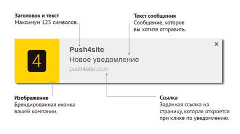 Push сообщение - это короткое уведомление, которое приходит прямо в браузер, после согласия на сайте. Уведомление содержит в себе короткий заголовок, текст, логотип и ссылку для перехода при клике. Для того, чтобы получать уведомления не требуется оставлять какие-либо персональные данные.
