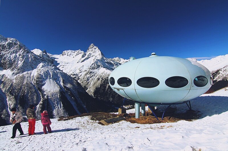Обычно в сталинской архитектуре преобладали брутальные железные массивы сталинской эпохи и нелепые панельные дома, ничем непримечательные и скучные. Но иногда в проектных институтах Советского союза создавались поистине новаторские образы. В данной статье приведены примеры таких, не побоюсь этого слова, шедевров. 1. Гостиница «Тарелка», Домбай. Появилась данная гостиница благодаря политическому сотрудничеству. Президент Финляндии Урхо Кекконен и председатель Совета Министров СССР Алексей Косыгин, летом 1969 года совершили переход через Кавказский хребет. Их маршрут похода проходил близ ущелья Алибек. Кекконена так сильно впечатлили живописные пейзажи и горы, что он решил подарить местности такой же яркий подарок, «неземной» арт-объект – дом «Футуро». Именно так, и не как по-другому, назвал своё творение автор проекта, Матти Сууронен, являющийся финским архитектором. Дом «Футуро» был спроектирован в конце 60-х годов, во время тотальной, так называемой «космизации». Многие люди в этот