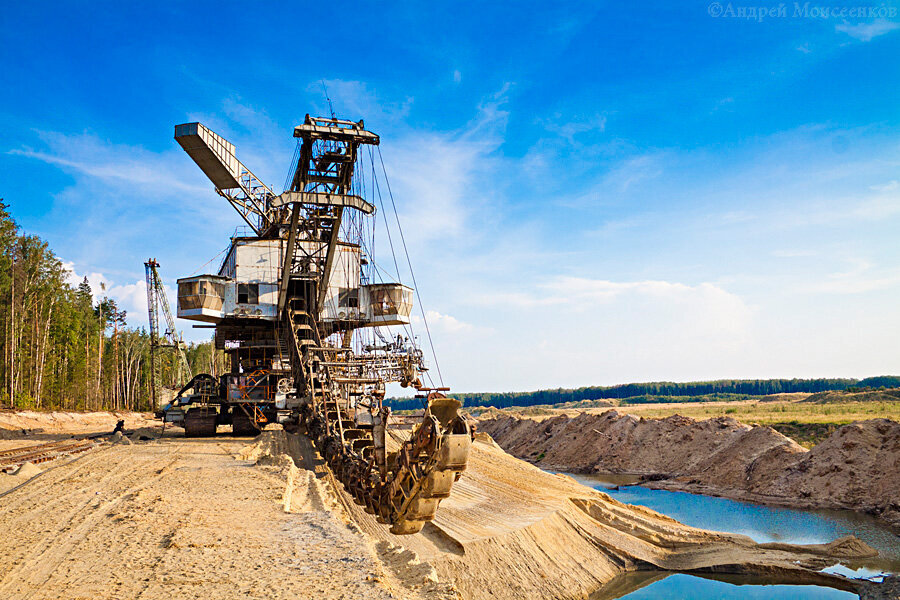 Takraf ERs 710 — Абзетцер — многоковшовый экскаватор. Создан этот монстр немецкими специалистами. В 1990 году отдельные части были привезены на площадку и собирались в течении года в единый комплекс. Сборка производилась нашими рабочими под руководством специалистов Takraf. Комплекс продуман буквально до каждой мелочи, позволяющей легко обслуживать его в процессе эксплуатации. Изначально был даже датчик скорости ветра, если скорость превышала 20 м/с, то срабатывала блокировка управления. Конечно же наши специалисты исправили этот «недостаток», защита была отключена. Еще на подходе к этим красавцам становится понятен их размер. Вокруг них есть люди, присмотритесь. Обратите внимание на масштаб. Ёмкость каждого ковша 710 литров — Ваша ванна дома вмещает около 200 литров. 36 ковшей приводятся в движение 400кВт двигателем через редуктор. Ковшевая цепь подвешена системой тросов. Лента-транспортёр, с её помощью производится погрузка песка в железнодорожные вагоны. Транспортёром управляе