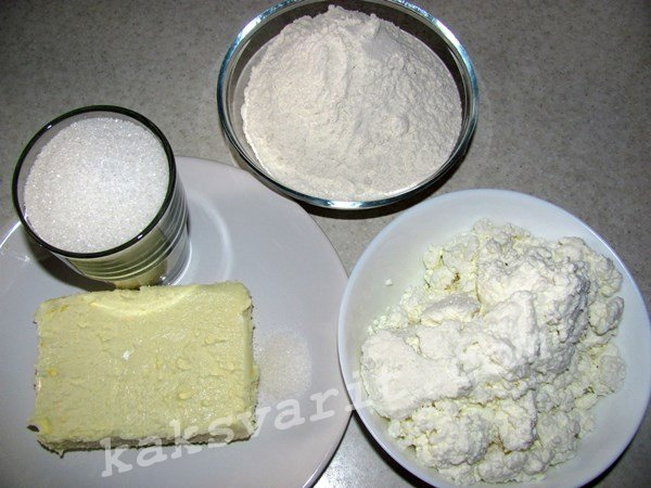 Продукты: творог — 400 г; масло сливочное (комнатной температуры) — 250 г; сахар — 100-150 г; пшеничная мука — 450-550 г;