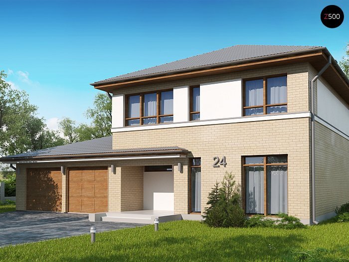 Zx24 GL2 - это проект дома в классическом стиле, являющийся версией элегантного двухэтажного дома z24 с увеличенным гаражом для двух машин и кабинетом на первом этаже. Классика формы и цветового оформления гармонирует с панорамным остеклением.