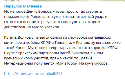 Протесты, суды, скандалы: в Самарской области хотят сместить регоператора по вывозу ТКО, прикрываясь интересами людей Самарская область стала первой в России, где суд первой инстанции признал тариф на вывоз твердых коммунальных отходов необоснованным. Истцами выступали представители политических сил, общественники и просто активные жители. Однако, некоторые из них не успокоились и после победного решения — и продолжили разогревать протестные настроения. Центр региональных расследований побывал в Самаре и узнал, как связаны лидеры мусорного протеста с олигархами, почему народный гнев работает на бизнесменов и как мусор рассорил самарских коммунистов. Часть 1: Конкурс Часть 2: Месть "ЭкоВоза" Часть 3: Матвеев Сразу после победы «ЭкоСтройРесурса», самарский телеграм-канал «Переулок Матвеева» анонсировал протестную активность, которую будет спонсировать Денис Волков . Сразу несколько телеграм-каналов утверждали, что это приведет к войне в коммунистической партии, ведь секретаря горкома КП