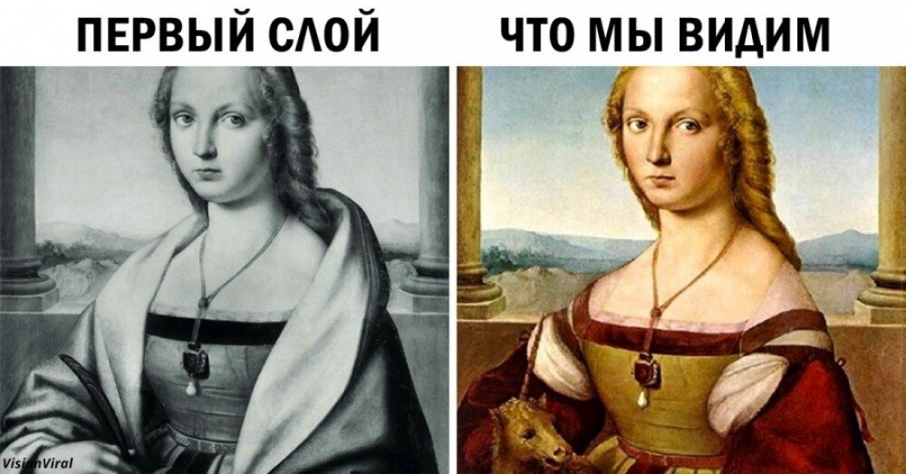 Когда же реставраторы продолжили изучение полотна, то выяснилось, что, во-первых, изначально вместо единорога дама держала в руках маленькую собачку. А во-вторых, сам Рафаэль рисовал только женщину, пейзаж и небо, а детали (колонны, парапет, собаку) дорисовывал другой художник.