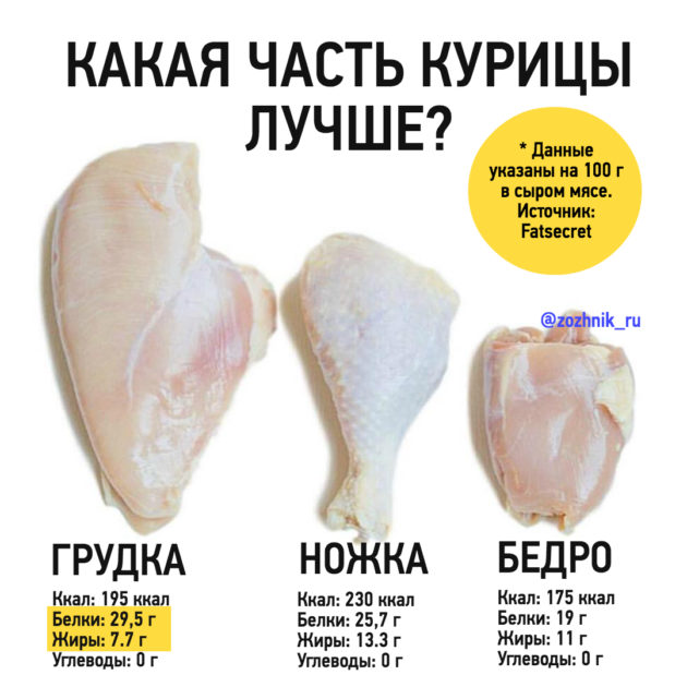 Куриная грудка – один из мясных символов полноценной еды. При всего лишь около 120 ккал на 100 граммов, в грудке – целых 28-29 граммов белка. Впрочем, с другой стороны куриная грудка славится тем, что она не такая вкусная и “суховата”. “Вы просто не умеете её готовить”, – сказали подписчики инстаграма @zozhnik_ru и по нашей просьбе накидали нам своих лучших рецептов – как сделать куриную грудку вкусно. Картинка из инстаграма @zozhnik_ru. Калорийность куриной грудки указана с кожей по fatsecret.ru. Добавить свой рецепт вкусной грудки можно на странице поста. Кстати, благодаря большому количеству белка, куриная грудка вошла в топ нашего рейтинга самых эффективных продуктов по количеству белка на 100 ккал (не граммов!) Правда, грудка индейки была даже чуть выше, но она не так распространена на отечественных столах. Как приготовить куриную грудку вкусно А теперь, собственно, рецепты от наших читателей – мы их пронумеровали для удобства, когда будете делиться этим постом: 1. 2. 3. 4.