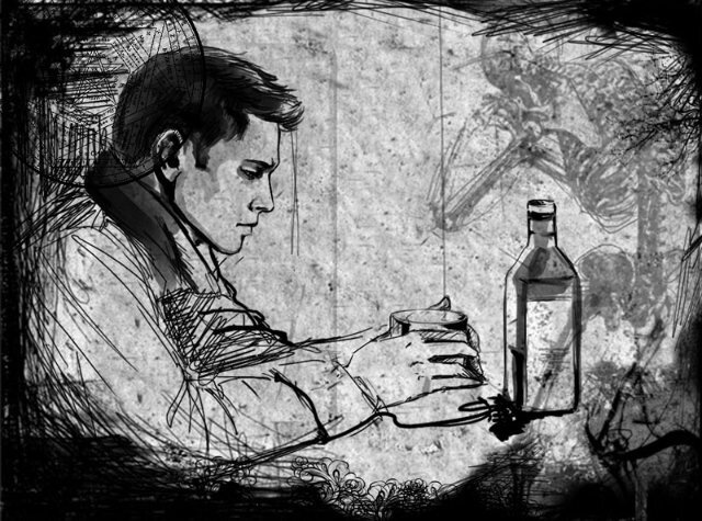 Зайдя, он запер за собой дверь. Открыл пыльную коробку и достал из неё бутылку коньяка. Открыв, начал жадно вливать её в своё горло. Потом резко остановился, будто одумался, и пришёл в себя. Внутри всё горело. Было даже больно от этого жара.