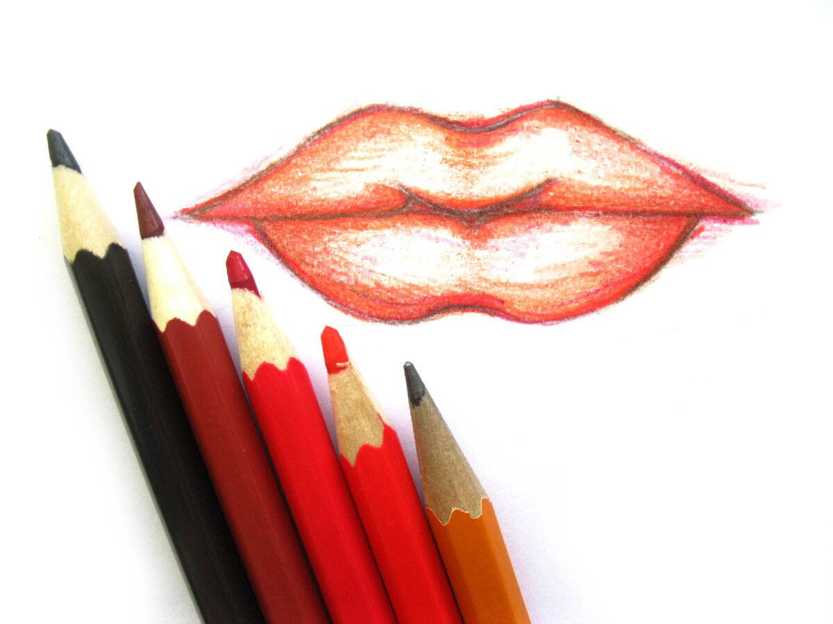 8. Берем красный карандаш и раскрашиваем губы легким на