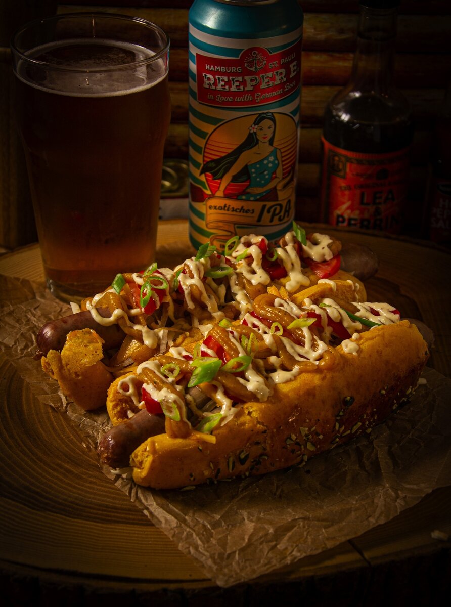 Булочку разрезали поперек, насыпали в нее немного лука и капусты, уложили колбаску, сверху помидоры, маринованная тыква и далее красиво все покрываем соусами. Можно дополнительно задекорировать зеленью или тонкими кольцами чили, тоже будет вкусно.