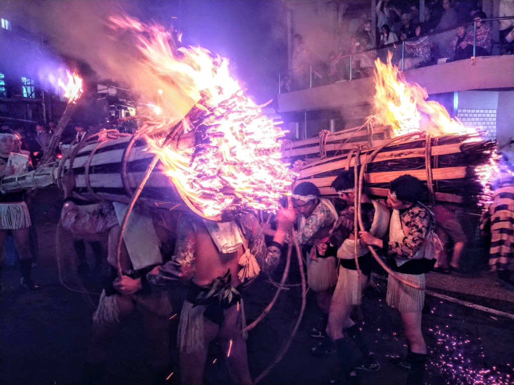 Один из самых красивых городов Японии - это Киото, на протяжении веков бывший столицей Страны восходящего солнца. Он же самый яркий, взрывной, жаркий - особенно в конце октября. Даже если на улице слякоть, туман и вообще противная погода, 22 октября будет зажигательным днем. Причем в самом прямом смысле этого слова. Ибо в это время мужское население Киото, от мала до велика, превращается в пироманов. Только стоит солнцу уйти за горизонт, как на улице появляются тысячи пацанов с зажжёнными факелами. По мере наступления темноты к ним присоединяются взрослые, которые шествуют с огромными факелами из тросника, вес которых порой доходит до ста килограмм. Кстати, обратите внимание на их костюмы - почему-то все факелоносцы с оголенными задами :-) Причину это "вентиляции" пятой точки не знаю, а чем вызвана радость ходить с огромными факелами по городу, сейчас расскажу. Дело в том, что 22 октября в Киото, это время проведения фестиваля огня Курама-но-хи мацури. Иными словами, праздник переноса