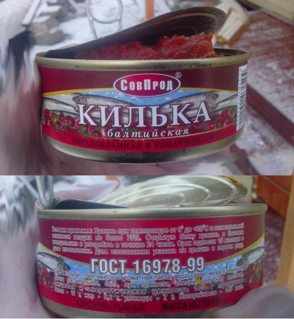 Думала полакомиться всеми знакомой и любимой килькой в томатном соусе. Купила ее про запас и положила в холодильник. И вот наварила картошки и так захотелось кильки, такой как раньше: обжаренной в томате... Сейчас в магазинах этой кильки столько, не знаешь какую выбрать. Не то, что раньше было: покупал всем известную баночку и точно знал, что находится внутри. А сейчас разные производители, разная цена, причем цены разнятся сильно от 12 до 98 рублей в ближайшем магазине. А главное состав у них одинаковый, написано везде красиво. Я обычно беру подешевле, но не самую дешевую, так меня внук научил. Говорит, что самое дешевое покупать нельзя - можно отравиться или есть будет невозможно! Выбрала кильку балтийскую от СовПрод за 36 рублей. Название внушало уверенность в качестве. Плюс на банке был указан ГОСТ, что тоже придает уверенности в соответствие продукта необходимым стандартам. Сверху банки ключ для открывания без консервного ножа, но мне все равно пришлось воспользоваться ножом, по-
