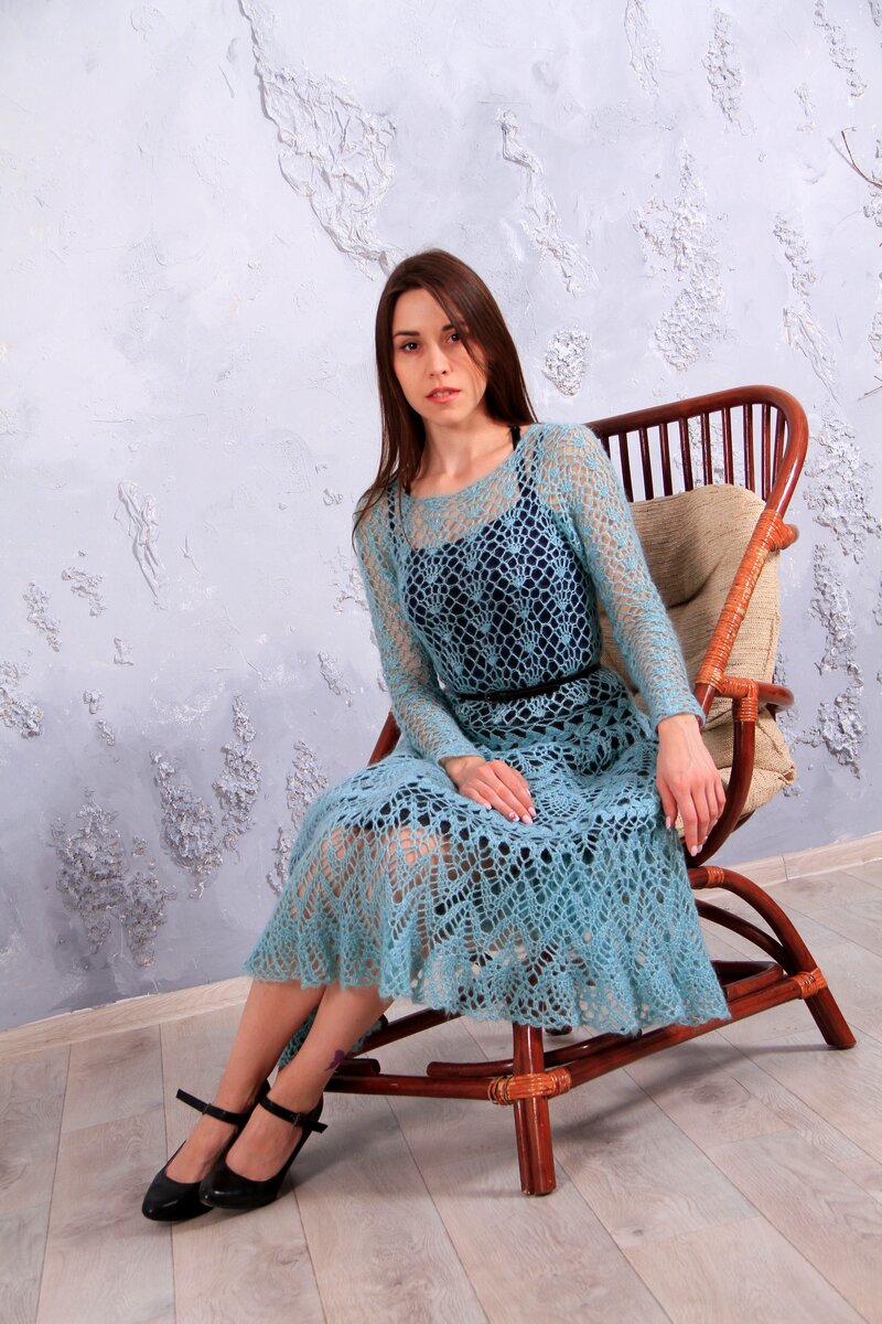 Оренбургская область славится пуховыми платками. В последнее время они вдохновляют мастериц на работу с воздушными вещицами из тончайшего кид мохера. Я тоже поддалась моде и два километра пряжи «спустила» на платье словно из зимней сказки. Легкое, весом не более двухсот грамм, но дарит тепло. Ношу его не только зимой, но и в межсезонье. И ловлю на себе восхищенные взгляды! Начиная вязать это платье, сомневалась, а смогу ли я его довязать. Ниточка очень тоненькая, почти незаметная, распускается тяжело. Для большей прочности я добавила к ней нитку натурального шелка. Он придал изделию изысканности и блеска. Платье вязала 4 месяца. Сделала себе подарок на день рождения. Захотелось показать платье миру, для этого организовали фотосессию с моделями в студии. Хозяйка студии Юлия, как оказалось, тоже вяжет и любит вязаные изделия. Она согласилась, с тем, что надо донести зрителям, что вещи ручной работы могут быть модными, стильными, элегантными. Юля считает, что «вязаные вещи, обяз