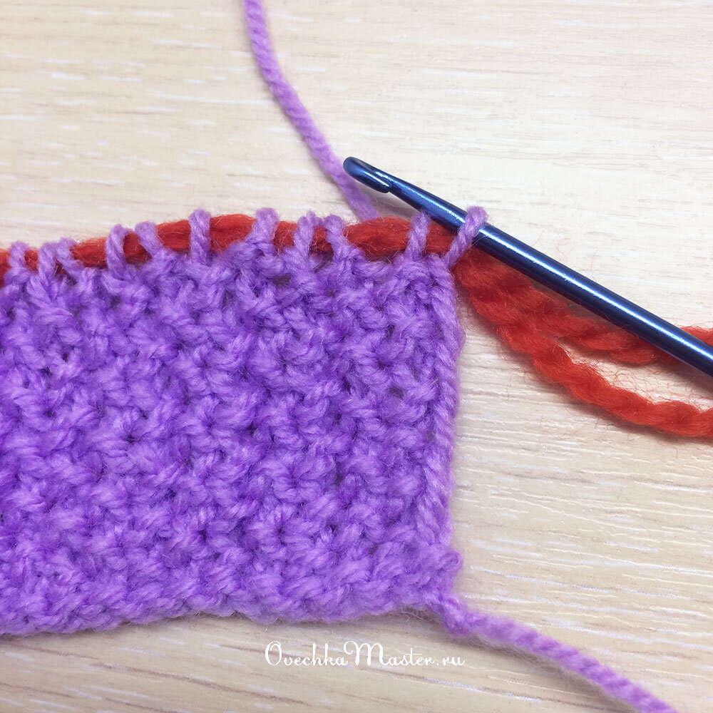 Всем добрый день. Узор "рис" один из моих любимых. Где-то я встречала другое его название - "Жемчужный узор". Но думаю, название не так важно. Я вязала таким узором кофточку себе. Правда с помощью обычных спиц. Вяжется он легко и выглядит очень даже интересно. И сегодня попробую связать этот узор с помощью крючка-иголки. Описание узора: 1-й ряд: *1 лицевая, 1 изнаночная*. Так вяжем весь ряд. 2-й ряд и следующие ряды: лицевые петли провязываем над изнаночными, а изнаночные над лицевыми. Первую петлю "снимаю", точнее просто снова одеваю на крючок. Следующая петля предыдущего ряда лицевая, значит провязываю ее изнаночной. Напомню, что изнаночные петли провязываются не справа налево, а наоборот, вводя крючок слева направо. Следующая петля предыдущего ряда изнаночная, значит провязываю ее лицевой. Лицевые петли провязываются элементарно. Вводим крючок справа налево (как обычно), захватываем рабочую нить. И вытягиваем петельку. Теперь еще раз подробнее покажу изнаночную петельку. Ра