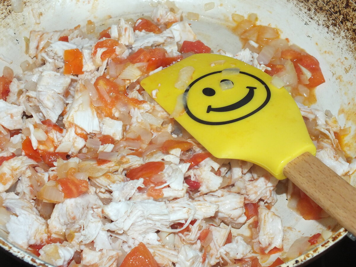 3. Куриную грудку разобрать на волокна и мелко порезать. Я порезала крупновато, было сложно лепить маленькие пирожки. Добавить курицу в сковороду и тушить до выпаривания томатного сока. Посолить, поперчить. Готовую начинку охладить.