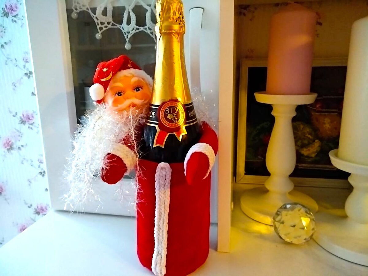 А пока мы в ожидании чуда и исполнения всех своих желаний. Шить такой чехол для шампанского лучше из благородного материала. Из бархата или велюра.