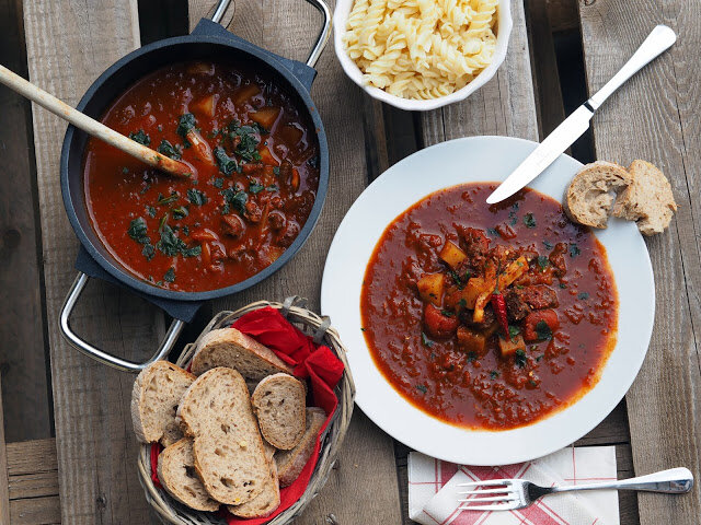 Когда вино уменьшится, рагу заливаю бульоном. Можно разбавить водой. Накройте и дайте покипеть в течение часа.