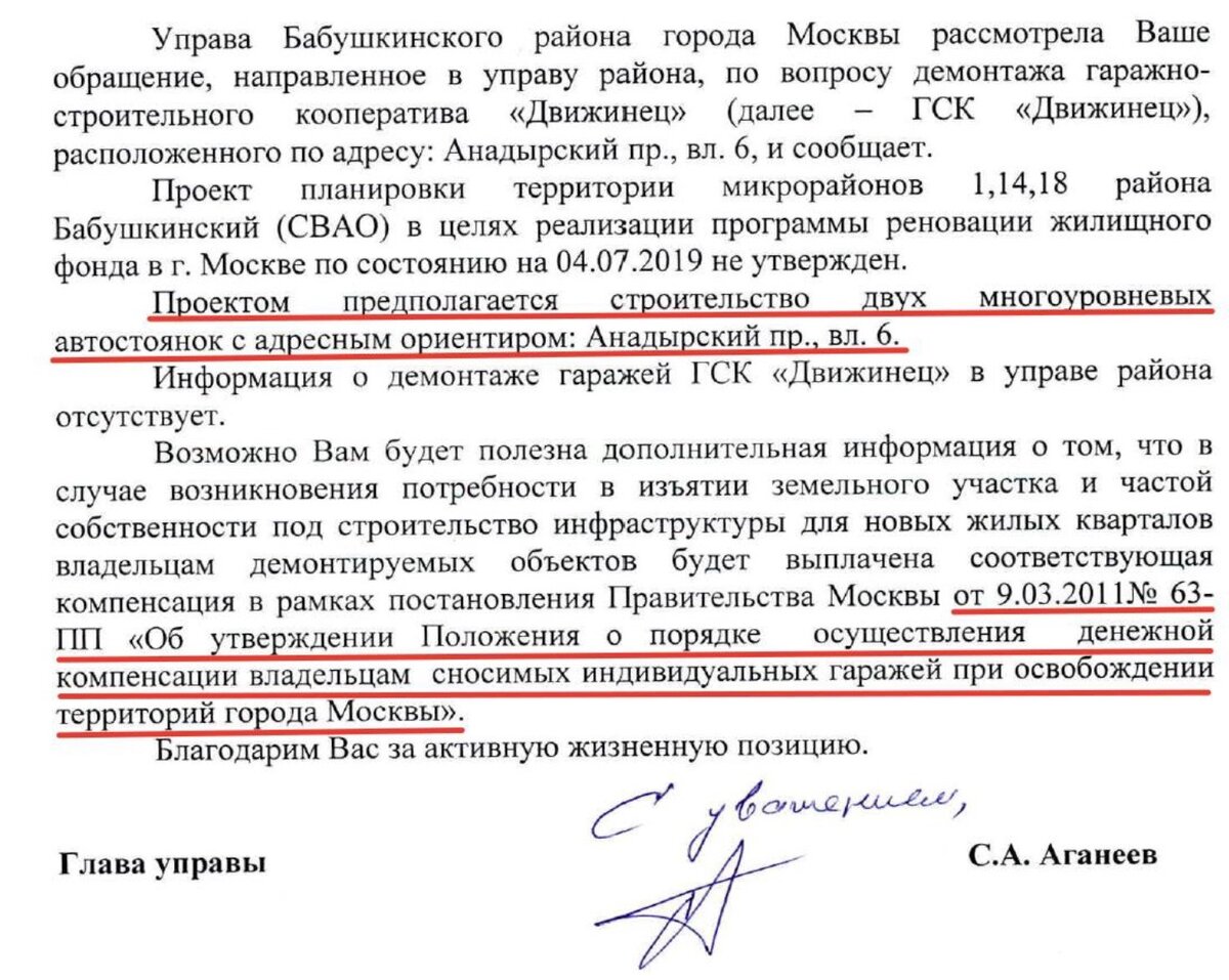 Какая очаровательная история, не могу не поделиться. Дело происходит в Бабушкинском районе. На Анадырском проезде находится ГСК "Движенец", располагающийся на земельном участке ОАО РЖД, в полосе отвода железной дороги, договор субаренды земли между ГСК и РЖД заключен на неопределенный срок. К слову, РЖД распоряжается этим земельным участком на основании договора аренды земельного участка, находящегося в собственности РФ, от 25 марта 2008 г. №Д-30/142-з, заключенного сроком на 49 лет. Но вдруг в Москве начинается реновация. Проект планировки для реновации микрорайонов 1, 14, 18 района Бабушкинский меняет красные линии, а на месте ГСК предполагается размещение многоярусного гаражного комплекса, а членам ГСК "Движенец" поступают предложения добровольно снестись и получить смехотворную компенсацию в триста тысяч рублей. Нет, я все понимаю, гаражный комплекс это важно и нужно при тотальном дефиците мест для хранения автомобилей, и я думаю, гаражники вряд ли отказались бы от больших прост