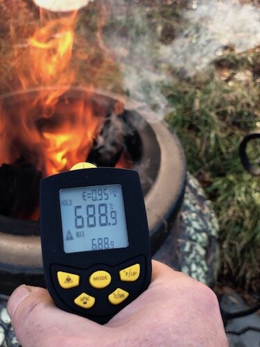 На улице -3°С, погода хорошая и мы собираемся топить тандыр. На корпусе еще не растопленного тандыра температура около 2°С. Как и положено, при растопке в холодное время, мы начинаем постепенно разогревать тандыр, подкладывая небольшие дрова. В нашем случае - это всегда береза или дуб. Минут через 35-30, мы подкладываем основную порцию дров и снимаем показания. На корпусе 58°С, внутри тандыра около 690°С. Такой перепад под силу огнеупорной керамике, но трещины начинают появляться. Дрова прогорают в течении часа и корпус разогревается. Причем, и снаружи тоже достаточно сильно. На корпусе фиксируем около 200°С, а внутри разогретого тандыра(на стенке) 410°С. Даем тандыру слегка отдохнуть, тем временем занимаемся подготовкой мяса. А у нас сегодня запланировано 4-5 закладок на большую компанию: это и 2кг перзолы куриной, 2кг баранины на кости и 2кг люля. А как же без них? Поскольку жарить предстоит много, угли не убираем, проверяем температуру на углях 517°С. Камень-жароотсекатель обяз