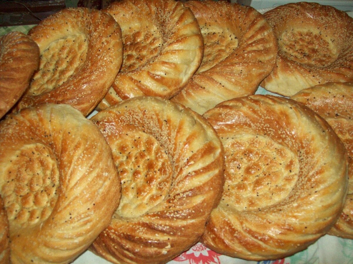 Среди изделий из теста в узбекской кухне особое место занимает хлеб - лепешки. Патыр - наиболее характерный для узбекского стола вид лепешек, приготовляемых из сдобного дрожжевого теста. Традиционно хлеб в Узбекистане печется в особой печи - тандире, но т.к. мы с Вами живем в условиях большого города, придется нам печь в духовке, что поделать... Единственно - ее нужно будет тщательно разогреть и протопить. Для приготовления теста нам понадобится примерно 1кг. пшеничной муки, 2 стакана молока, 50гр. дрожжей, 0,5 ложки соли и сахара, примерно 150гр. бараньего сала - курдюка. Растапливаем бараний жир Молоко подогреваем и растворяем в нем дрожжи и 0,5 ст.ложки сахара В муку добавляем соль, растопленный жир и молоко, замешиваем тесто Тесто в чашке или эмалированной кастрюле накрываем полотенцем или бумажной салфеткой, помещаем в теплое место, чтобы тесто поднялось, минут на 20-30. Когда тесто поднялось, отрезаем от него небольшой кусок (традиционно патырные лепешки большого размер