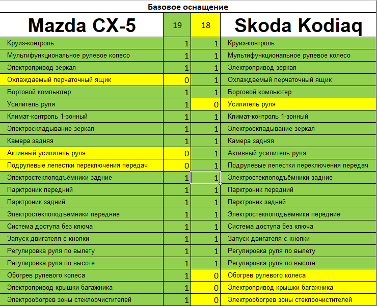 Продолжаю рубрику по сравнению автомобилей. Сегодня ЯПОНИЯ против ЧЕХИИ их " 👍 " и " 👎 " относительно друг друга. Mazda CX-5 комплектация SUPREME Skoda Kodiaq комплектация STYLE Перейдем к автомобилям: 1. Комфорт: Оснащение двух автомобиле на высшем уровне, но вот Мазда в базовом оснащении именно это комплектации предоставляет вам чуточку больше нежели Шкода, VAG в принципе за небольшую плату тоже это даст и возможно больше. Таким образом выбирая автомобиль вы можете его собрать для себя... 12 пакетов у Шкоды и 5 у Мазды. На Шкоде вы точно купите парочку, соответственно машина станет дороже. А в стандарте Мазда уже больше предлагает! 2. Безопасность Опять же Шкода предлагает доп пакеты, Мазда все это уже имеет в базе. 3.Обзор И снова Мазда лучше, хотя здесь преимущество не очевидное. 4. Мультимедиа 6. Динамические характеристики Заводы заявляют следующие характеристики: Разгон до 100 км/ч Mazda CX-5 9 с при двигателе в 194 л.с./257 Н.м. Skoda Kodiaq 7.8 с при двигателе в 1