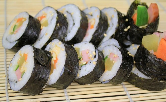 1. Кимбап (кор. 김밥) — закуска, заимствованная из японской кухни во времена оккупации (с 1910 по 1945 гг). Блюдо представляет собой роллы, но в отличие от оригинала в состав начинки входит не сырая рыба, а ветчина, омлет, такуан, огурцы, морковь и другие овощи (свежие или маринованные). Ещё одной важной особенностью является заправка для риса — вместо уксуса используется кунжутное масло. За столетнюю историю кимбап прочно укрепил свои позиции в корейской кухне