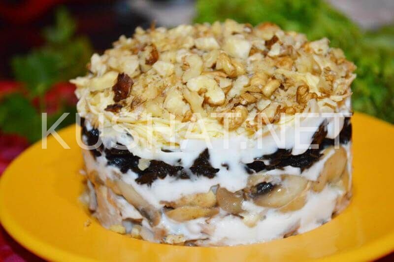 О существовании такого вкусного салата, как салат «Увертюра» с курицей и грибами я узнала не так уж и давно. Салат поразил меня своим вкусом, с тех пор я готовила его уже несколько раз. Изюминкой салата является чернослив, который придает ему приятные нотки копченостей. В составе салата присутствуют также и грецкие орехи, которые делают его еще вкуснее. Если вам нравится в салатах сочетание курицы с черносливом, то такой салат «Увертюра» вас, точно, не разочарует. Если посмотреть на состав салата, то сразу можно заменить, что все продукты в нем достаточно калорийные, поэтому даже небольшой порцией салата можно легко и быстро насытиться. http://www.kushat.net/recipe-items/salat-uvertyura-poshagovyj-recept-s-foto/