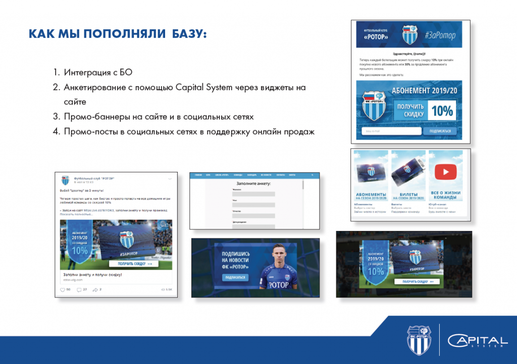 - создание базы болельщиков: импорт старой базы данных, интеграция с билетным оператором, анкетирование через сайт и социальные сети, подписки на рассылку итд;