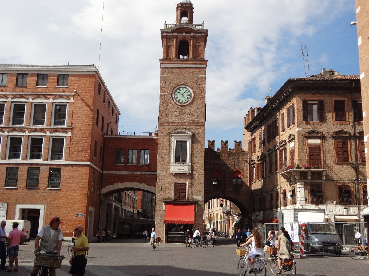 Центральная площадь Феррары, на которую попадаешь, пройдя мимо замка, и куда выходят Герцогский Дворец и Кафедральный собор, дала начало одному из центральных современных проспектов города - Corso Martir della Liberta. Типа Проспект Свободы. Следует сказать, что еще одной напастью города - были частые наводнения, когда воды реки По заливали город На стене рисками отмечены уровни воды при самых больших наводнениях. Площадь около замка называется площадью Савонаролы, родившегося в Ферраре в 1452 г. В центре установлен потрясающий памятник знаменитому священнику. Монах - доминиканец представлен с вознесенными руками, читающий свои мятежные проповеди. Савонарола происходил из старинного знатного рода. Родители готовили его к медицинской карьере, но в 1475 г. он тайно бежит из дома в доминиканский монастырь, где вскоре стал известным проповедником. Успех его проповедей был необыкновенным. Савонарола обладал огромным влиянием на слушателей. Так после проповеди о женских нар