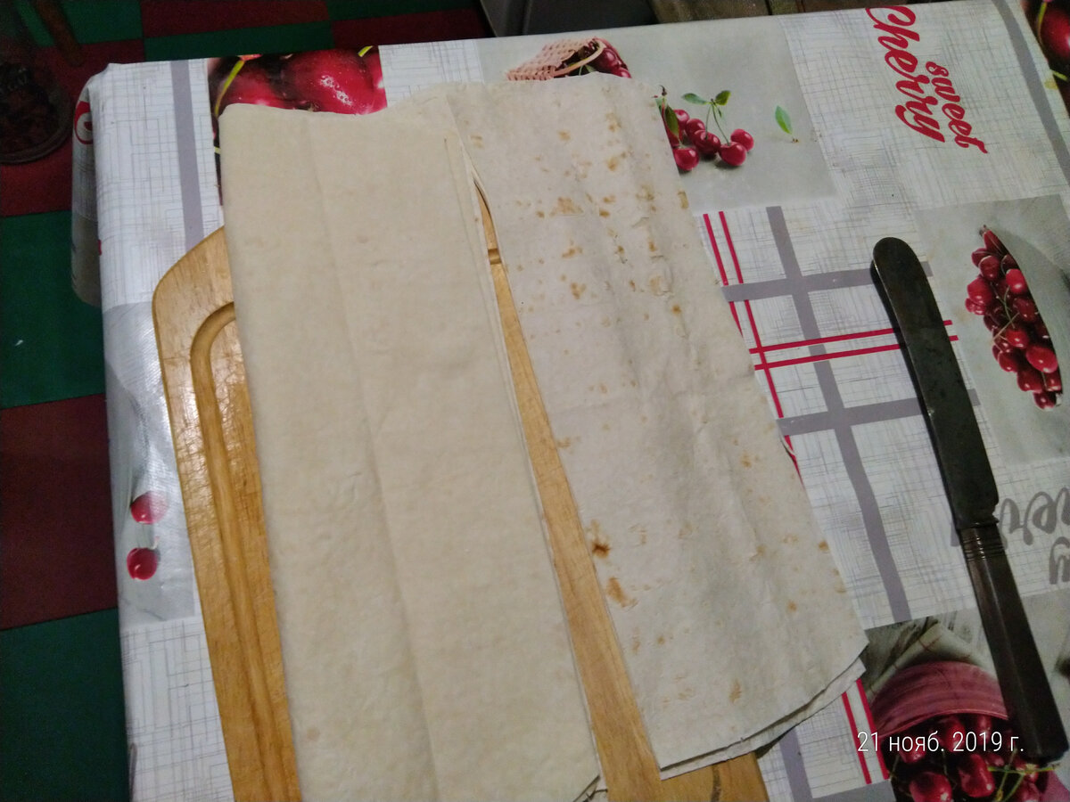 В Азербайджане и Турции такие блинчики называются "Кутабы" . Частенько в Турецких отелях их готовят прямо при Вас, это своеобразное шоу по кулинарии на берегу средиземного моря . Как говорится всё включено . Заказывайте! Но Мы не в Турции и делать такие блинчики с начинкой как-то лениво! Поэтому берем лаваш армянский -упаковку , нарезаем его полосками ,соотношение сторон 1 к 3 . У меня получилось 10 полосок из которых выйдет 5 крупненьких конвертиков. Начинка может быть любой, но мне особо нравится творог с зеленью и сыром. Итак Нам понадобятся: 1.-Упаковочка творога желательно рассыпчатого зернистого. 180 грамм. 2- Любимая вами зелень в данном случае-укроп. 3.Нарезанный полосками лаваш. 4. Тертый сыр . грамм 50 5 . И одно сырое Яйцо . Складываем две полоски крест на крест. Замешиваем.(Зелень, Творог и Сыр) Выкладываем начинку на перекрестие. Заворачиваем края ,начиная с нижней полоски. И края с полоски на которой лежит начинка. У нас получилось пять аккуратных конвертик