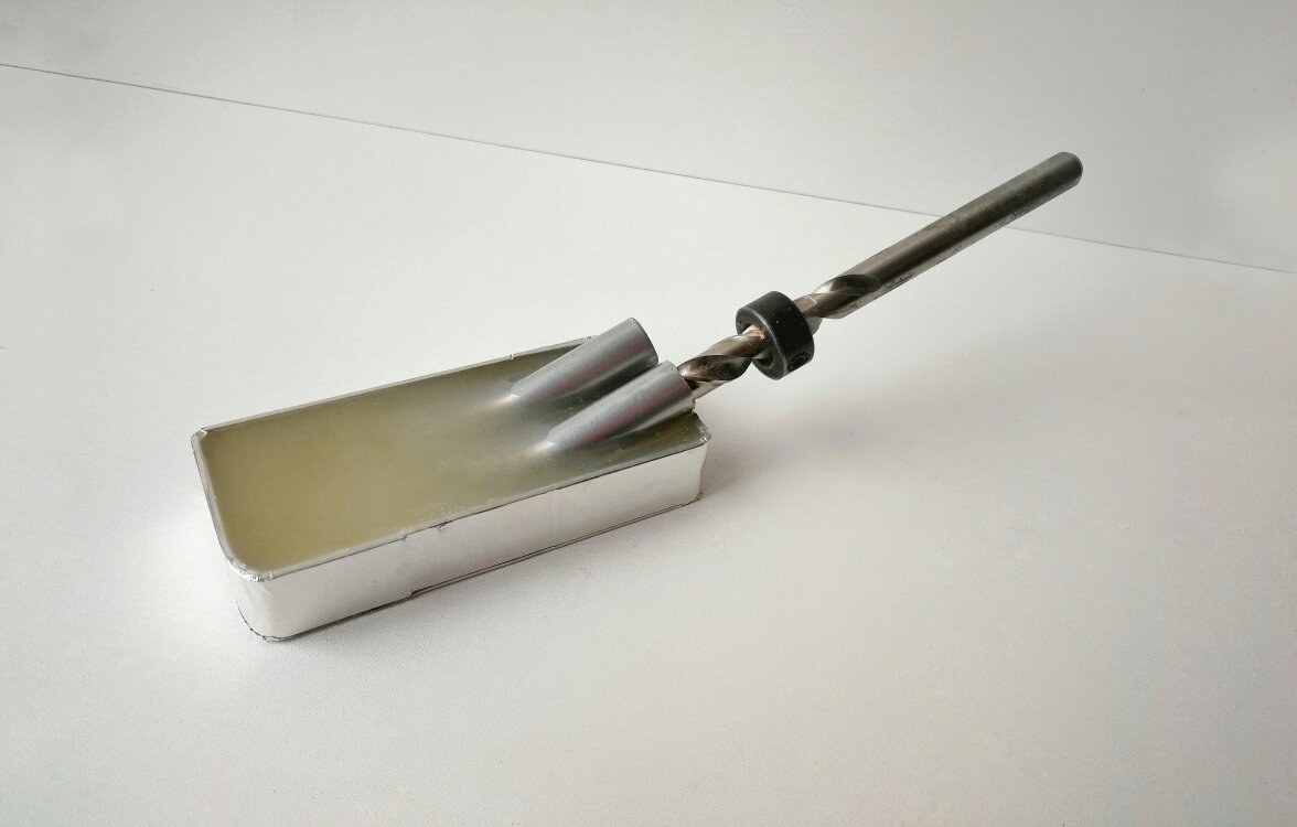 - Лента-скотч алюминиевая. Для трубки я использовал металлический уголок. Внутренний диаметр 9.1 мм. Сверло я заказывал в Китае. Диаметр сверла 8,9 мм. Отпиливаю лишнее от уголка. Трубку разрезаю под углом 75 градусов. Получилось 2 трубки. Приступаю к изготовлению формы для заливки. Для этого взял 2 металлических уголка. Cогнул одну из сторон под 90 градусов. Получившуюся форму обклеил алюминиевым скотчем. Беру старую сковородку, размещаю в ней форму и закладываю кусочки термоклея. Когда весь клей расплавился, убрал пузырьки воздуха зубочисткой. Клей застыл и самое время проверить кондуктор в действии. Фиксирую струбциной и сверлю. Получилось достаточно неплохо. Входные и выходные отверстия получились на одном уровне. Соединение получилось ровны