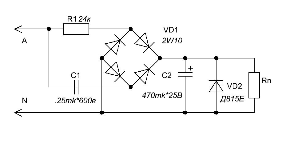 Для питания маломощных потребителей очень часто используются однополупериодные выпрямители. В качестве ограничителя тока используются резисторы и конденсаторы (емкостное сопротивление). Недостаток этих выпрямителей - большие пульсации выходного напряжения. Для уменьшения их приходится ставить электролитические конденсаторы большой емкости. Недостаток этих выпрямителей можно устранить, если использовать одновременно в качестве ограничительных сопротивлений резистор и конденсатор. Как известно из электротехники ток через резистор совпадает с напряжением по фазе, а на конденсаторе ток опережает напряжение на 90гр. Учитывая это можно улучшить характеристики таких выпрямителей. Принципиальная схема выпрямителя представлена на рис.1. Он содержит выпрямительный мост VD1, ограничительное сопротивление R1, конденсатор С1, стабилитрон VD2. Работает этот выпрямитель следующим образом. При подаче положительной полуволны на вывод А ток идет через конденсатор, мост, стабилитрон VD2 - вывод N. По