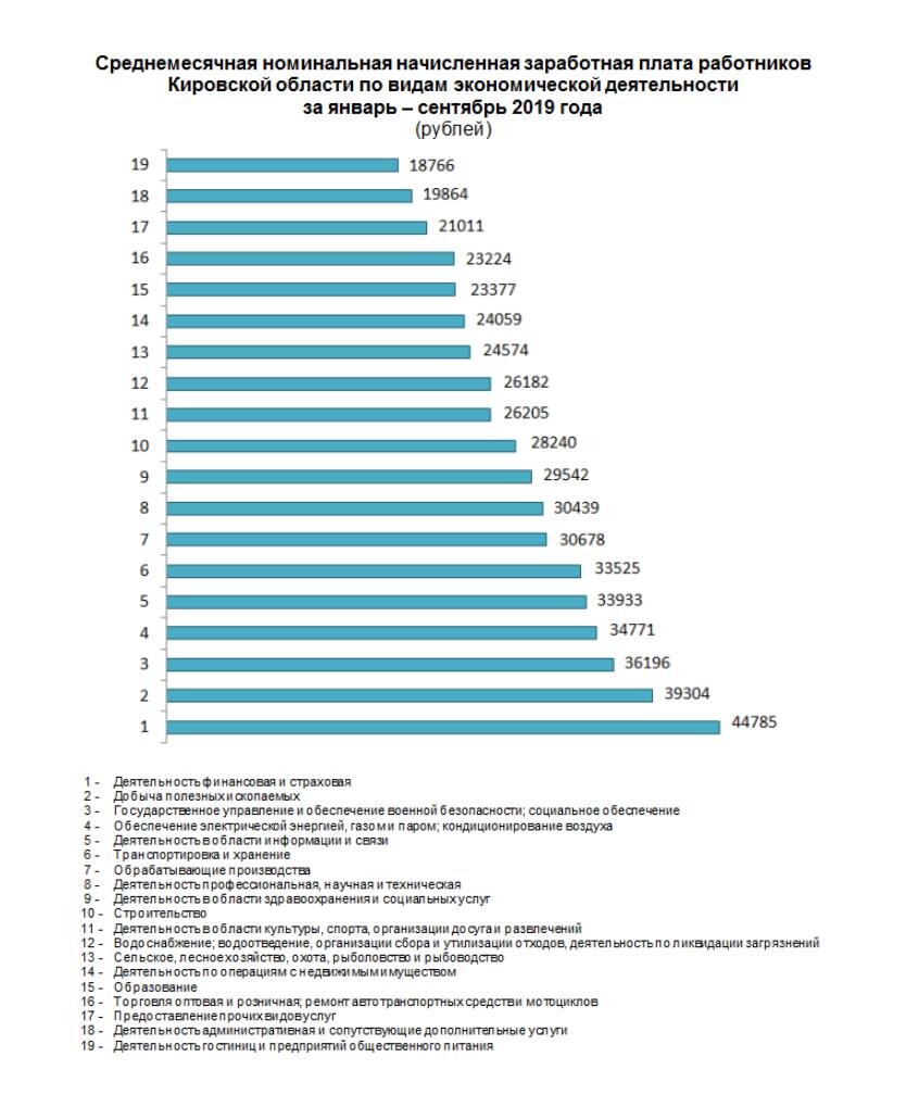 Так, среднемесячная номинальная зарплата работников в Кировской области за период с января по сентябрь 2019 года составила 29,1 тысяч рублей.