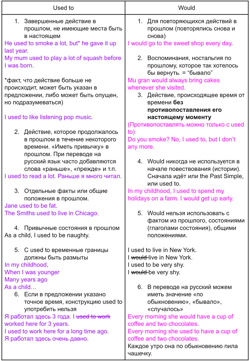 Время идет, все меняется, меняются и наши привычки. И многие из тех, что мы имели ранее, сегодня отсутствуют в нашей жизни Чтобы рассказать о своих привычках в прошлом, которые мы не совершаем в нашем настоящем, существует две конструкции: used to и would. В чем же их отличие? Как мы видим главное различие между used to и would заключается в том, что would нельзя использовать с глаголами состояния (полный список state verbs здесь),в ситуациях, описывающих факты и общие положения. Однако, would можно использовать как и used to с dynamic verbs (глаголами движений). Например, take, spend, drive, dance и т.п. Помимо этого, ещё одним отличием would от used to является то, что would крайне редко используется в отрицательных предложениях (лучше заменить на didn’t use to) и не используется в вопросительных предложениях (лучше заменить на did ____ use to...?). Что же касается used to, то в разговорном английском часто используется для отрицания never used to, чем didn’t use to. Ещё один интере