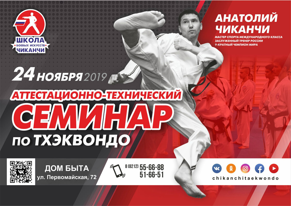 В воскресенье, 24 ноября, в зале Школы боевых искусств в Доме быта пройдет аттестационно-технический семинар по тхэквондо. Проведет его заслуженный тренер России, мастер спорта международного класса, обладатель черного пояса VI дана Анатолий Чиканчи. В 10:00 занятия начнет группа поясов от бело-желтого до желто-зеленого. В 11:30 к тренингу приступят спортсмены поопытнее – от зеленого пояса и старше. – Приближается время аттестации, и мы специально проводим такие направленные тренировки, чтобы каждый желающий смог дополнительно отточить свое мастерство, обратить внимание на свои слабые стороны, – отметил Анатолий Чиканчи. Для участия в семинаре требуется добок и сменная обувь. Записаться можно по телефонам: +7(8212)55-66-88, +7(8212)51-66-51. Жмите "Лайк" и подписывайтесь на наш канал.