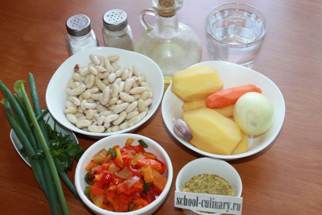 Для вкусного обеда подойдет многокомпонентое рагу с фасолью. Сочетание фасоли с картошкой, луком, морковью, болгарским перцем, чесноком и зеленью понравится своей завершенностью. Палитра вкусов и целая гамма оттенков украсит праздничный стол и будничную трапезу. С рецептом справится и новичок, а результат порадует всех. Ингредиенты: Приготовление: Фасоль намачиваем в холодной воде, оставляем на ночь. Затем хорошо моем, удаляем плохие фасолинки. В кастрюлю или казан наливаем воду, кладем фасоль и отвариваем до полуготовности в течение получаса. Время зависит от сорта фасоли. Очищаем, моем и измельчаем лук и морковь. Трем на терке морковку, режем кубиками лучок. Все складываем в сковороду с растительным масло, жарим 5 минут. Добавляем болгарский перец. Можно брать замороженный или свежий. Тогда его нужно разрезать на две половины, удалить плодоножки и семена, порезать кусочками. Жарим 5 минут. Картофель очищаем и моем, режем кубиками и отправляем к полуготовой фасоли. Добавляем жареные