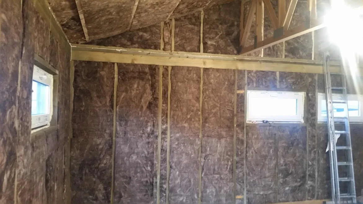 Продолжаем утепление, ссылка на начало процесса Фото на сей раз не будет, только видео! :) Одна стена полностью утеплена, 150 мм между стойками, 50 мм поверху с перекрытием швов конечно же.