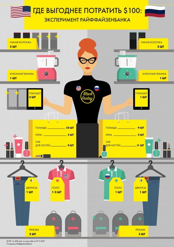 Накануне «Чёрной пятницы» выясним, на что можно потратить $100 в США и России. Аналитики Райффайзенбанка в ходе эксперимента рассматривали товары трёх категорий, наиболее популярных во время распродаж Черной пятницы: техника, косметика, одежда сегмента масс-маркет в самых массовых онлайн-сетях.