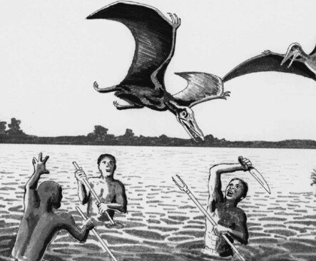 1923 год. Лондон. Выходит книга известного писателя и антрополога Френка Меланда, под названием "В заколдованной Африке" Когда автор прибывал в самом центре Африки, то собрал некие очень интересные сведения о некоем странном животном. Местные называют его - "конгамато" Обитает оно в местности Джиунду. Местность в основном болотистая. Находится в Замбии, около границ нынешнего Заира. Из описания: животное похоже на большую птицу, а точнее на ящерицу с крыльями из кожи, как у летучей мыши Размах крыльев животного от 1.2 метра до 2.5 метров. У существа, вообще отсутствует оперение, кожа гладкая и голая. В клюве находятся огромные и острые зубы. И вот, когда автор уже практически окончательно убедился в существовании этого животного, когда африканцы всё больше и больше описывали ему это существо. Он пошел на один эксперимент, где решил показать им книги, с нарисованными этими существами. Без сомнения, аборигены указали на птеродактиля, прошептав "конгамато" Местное чернокожее население уб