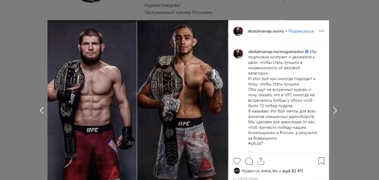 Мы подписали контракт и движемся к цели, чтобы стать лучшими вне зависимость от весовой категории. И этот бой как никогда подходит к тому, чтобы стать лучше. Они оба идут на встречных курсах и я хочу сказать что в UFC никогда не встречались бойцы чтобы у обоих было 12 побед подряд. Я называю это бой мечты для всех фанатов смешанных единоборств. Мы делаем все зависящее от нас чтобы принести победу нашим болельщикам из России