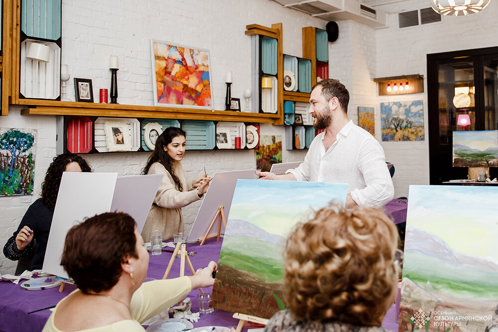9 ноября мы в третий раз провели наш рисовальный мастер-класс вместе с художником Эмилем Абрамяном. Темой был пейзаж «Подснежники на горе Арагац». Когда я пришла с небольшим (опять) опозданием, у Эмиля уже всё было готово: холсты, краски, кисти, стаканы с водой. Он начал рассказывать участникам, что их ждёт на мастер-классе. «Поднимите руку, кто был на горе Арагац», — обращается Эмиль к аудитории. Рука всего одна, но это и неудивительно: не каждому выпадает возможность подняться на «сестру» Арарата. «Проводим линию горизонта, намечаем очертания холмов», — начал объяснение Эмиль. На всех холстах синхронно появляются силуэты горных пиков. Следом за холмами начало вырисовываться небо. «В этот зеленоватый свет добавьте немного фиолетового», — объяснял Эмиль, когда пришло время рисовать солнце между горами. Смешивая цвета, наши художники искали правильные оттенки, чтобы показать плавный переход ярких солнечных лучей в голубое небо. На завершающем этапе участники приступили к прорисовке горн
