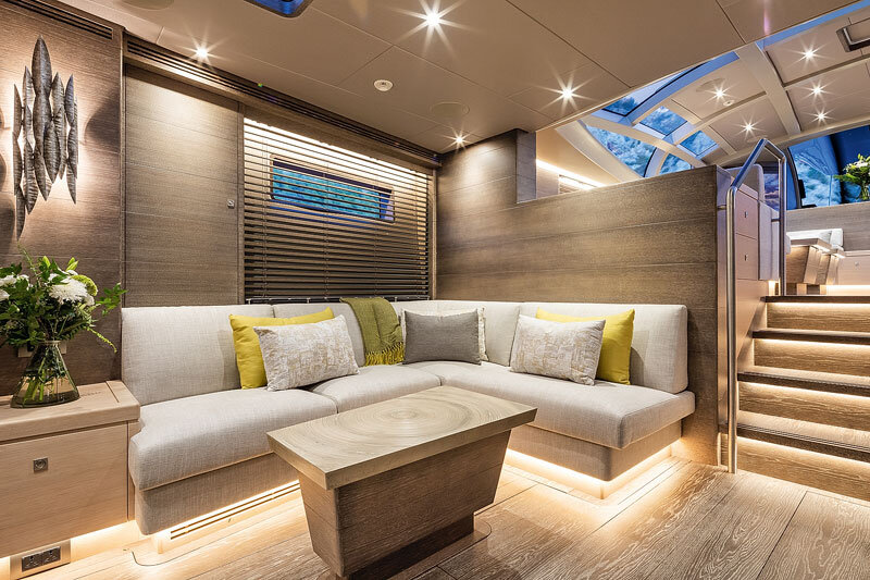 Разработавшая для яхты интерьеры британская компания Adam Lay Studio стремилась воссоздать в них естественную красоту «домашних» островов владельца яхты. Получился сдержанный интерьер в натуральных насыщенных тонах, дополненный яркими цветовыми акцентами в мягкой мебели и отделке. Минималистичный стиль, расцвеченный невероятными красками Нормандских островов, выглядит свежо и притягательно. «Мы подвергли интерьеры легкому выветриванию, – говорит Адам Лэй. – Так они смотрятся еще более естественно и способствуют полной релаксации». Непрямое светодиодное освещение визуально расширяет пространство. Естественный свет, а его здесь много, проникает в жилые помещения через большие иллюминаторы. Но вернемся наверх. Покрытие палубы выполнено из синтетического материала Flexiteek и частично «перетекает» на транец, подчеркивая фирменный стиль Liara. На ощупь этот материал невозможно отличить от натурального тика, но при этом он более практичен – не требует трудоемкого ухода, не скользит и не нагревается.