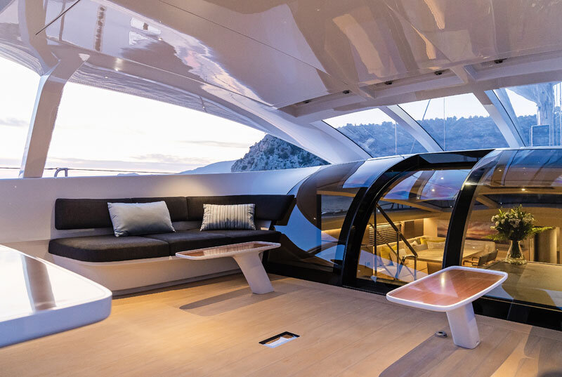 Кокпит и салон, спрятанный под надстройкой с купольным остеклением, – идеально организованные кают-компании. И там, и там приятно проводить время за завтраком, ужином или просто созерцанием проносящихся за бортом морских красот.
