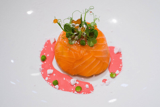 ИНГРЕДИЕНТЫ Филе лосося 530 г Соль 20 г Сахар 4 г Черный перец горошком 0,3 г Измельченный укроп 30 г Оливковое масло 70 мл Яичный желток 2 штуки Растительное масло 125 мл Лимонный сок 12 мл Дижонская горчица 12 г Вода 25 мл Свекольный сок 20 мл Отварной картофель 120 г Морковь 80 г Огурцы 80 г Яйцо куриное 2 штуки Замороженный зеленый горошек 40 г Яблоко 80 г Перец черный молотый по вкусу Красная икра 5 г Кресс-салат 2 г Зеленый горошек по вкусу Безе 1 ИНСТРУКЦИЯ ПРИГОТОВЛЕНИЯ 1. Приготовить рыбу. Соль (20 г) смешивают с сахаром (4 г), перец горошком (0,25 г) измельчают в мельнице. Подготовленное филе лосося (530 г) укладывают в лоток, посыпают зеленью укропа (25 г), смесью соли, сахара и перца. Ставят в холодильник для просаливания на 24 часа. Вынимают из лотка, счищая лишнюю соль и укроп. Укладывают в вакуумные пакеты, предварительно посыпав рубленым укропом (5 г )и черным перцем (несколько зерен), поливают маслом оливковым (5 мл). Вакуумируют. Готовое фи