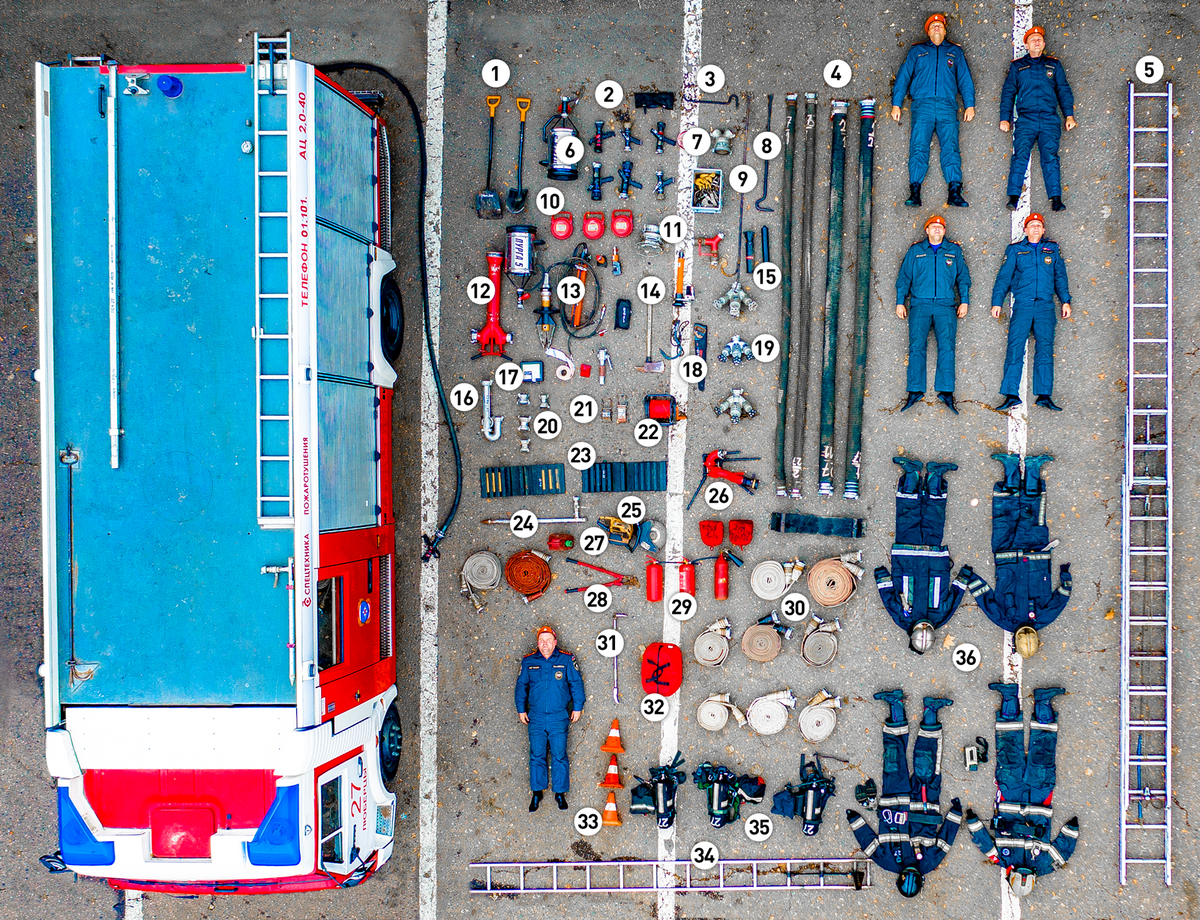 Станислав, снимающий репортажи о работе пожарных, сделал фото в формате популярного сейчас «тетрис челлендж», на котором запечатлел «содержимое» пожарной машины и полную экипировку пожарного. Давайте разберемся, из чего они состоят.