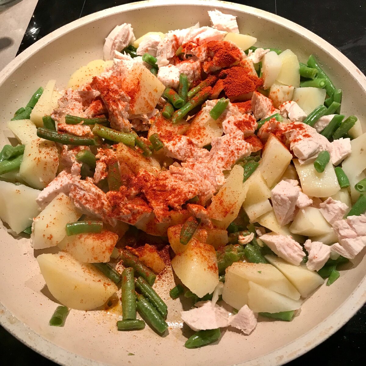 Бывает так, что не успел сходить в магазин и думаешь, что бы такого изобразить на ужин из тех продуктов, которые остались дома. Так случилось сегодня. И внезапно настолько удачно, что даже решила с вами поделиться рецептом. И так для приготовления я взяла: Приготовление нехитрое: На разогретую сковородку добавить масло для жарки и высыпать фасоль. На средней мощности под закрытой крышкой тушить минут 10. Пока фасоль тушится, режем вареную картошку, добавляем к фасоли и тушим минуты 3, потом добавляем нарезанную грудку, добавляем специи, соль и тушим пока фасоль не приготовится, периодически помешивая. Кстати приправа у меня такая: Я покупала через интернет, но видела в Перекрёстке. Это плоды перца, которые коптились над дубовыми дровами и затем были перемолоты в порошок. Очень интересный букет вкусов. Готовый ужин уже съели, я успела взять одну ложечку, эх) Кстати очень удобно бывает сварить несколько куриных грудок и из них готовить что-нибудь. Я так часто делаю:) Потом делаю из