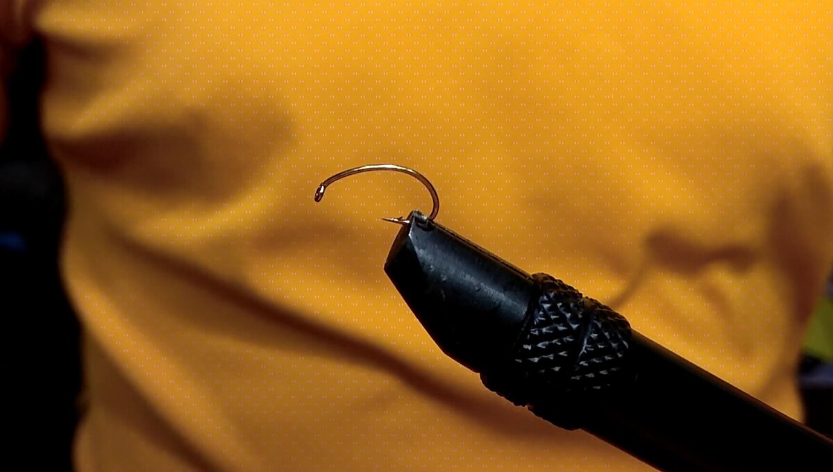 Возьмём крючок номер 12. Фиксируем монтажную нить примерно до центра цевья. Берём люрекс.