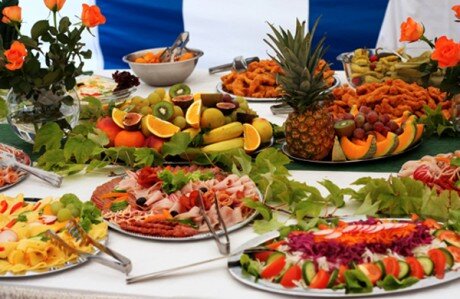 В среднем, одна порция закусок или салата на взрослого человека составляет 250 грамм. После особо длительной прогулки или в жаркое время года, порцию можно увеличить. Как показывает практика, самые популярные закуски на свадебных столах – элементарные нарезки (овощные, рыбные, мясные). С ними можно и поэкспериментировать, разнообразить.